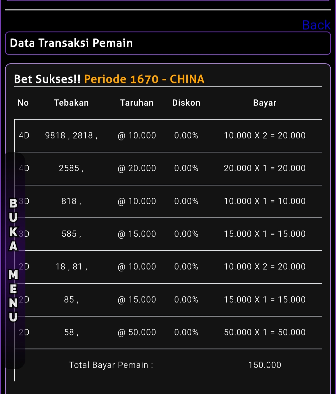 Rumus Angka Mati berdasarkan kepala harian | 05 06 08 10 15 16 17 18 19 20 21 26 27 28 29 30 32 37 38 39 40 41 43 48 52 53 54 63 64 65 74 75 76 86 87 94 95 97 98 |