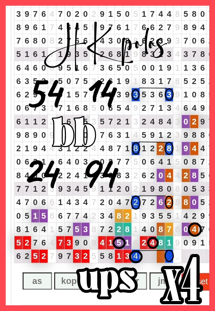 | Rumus Angka Mati berdasarkan kepala harian | 07 08 09 10 18 19 20 21 31 32 38 39 40 42 49 50 51 52 53 54 59 60 61 62 63 64 65 71 72 73 74 76 82 84 85 87 96 97 98 |