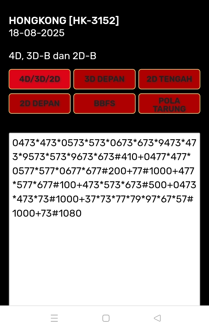 Prediksi Ini Berubah secara otomatis sesuai hari dan result pasaran masing-masing. Untuk melihat prediksi sebelumnya klik tombol nomor hitam diatas
