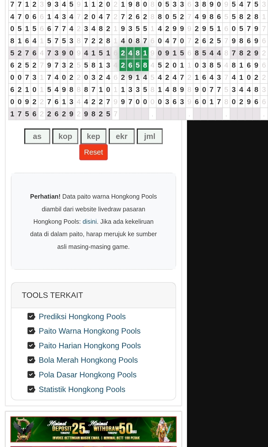 | Rumus Angka Mati berdasarkan kepala harian | 04 05 06 07 08 09 10 15 16 17 18 19 21 26 27 28 29 30 32 37 39 41 42 43 52 53 54 63 64 65 75 76 83 84 86 87 94 95 97 |