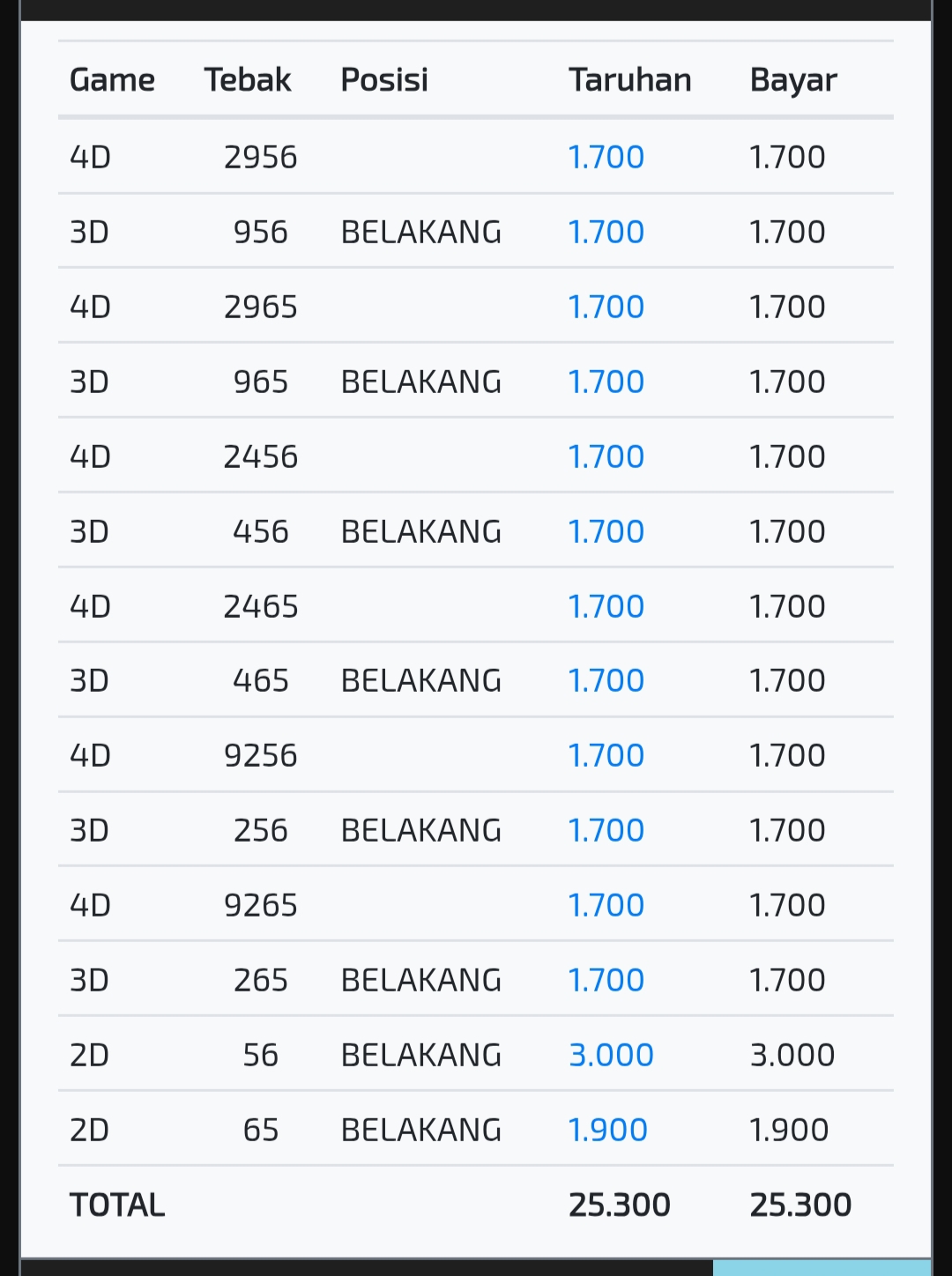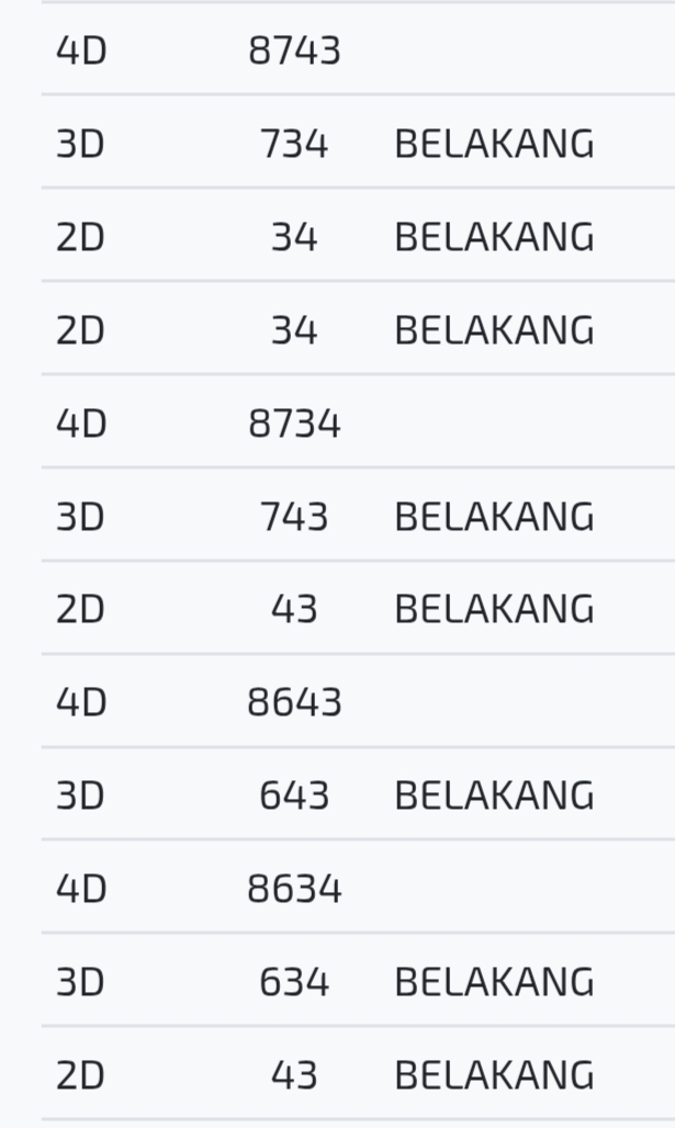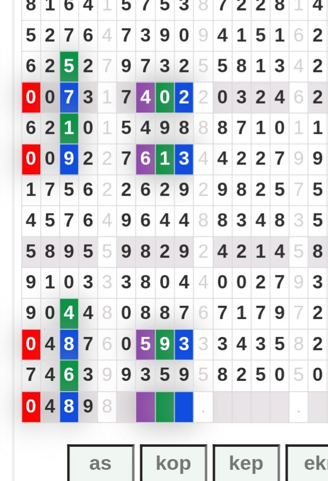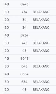 | Rumus Angka Mati berdasarkan kepala harian | 08 09 10 16 17 19 20 27 28 30 31 32 37 38 39 40 41 42 43 48 49 50 51 52 54 59 60 62 63 65 74 75 76 85 86 87 96 97 98 |