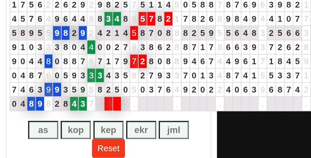 | Rumus Angka Mati berdasarkan kepala harian | 07 08 09 10 19 20 21 27 28 31 38 39 40 41 42 43 48 49 50 51 52 53 54 59 60 61 62 63 65 71 73 74 76 85 86 87 96 97 98 |