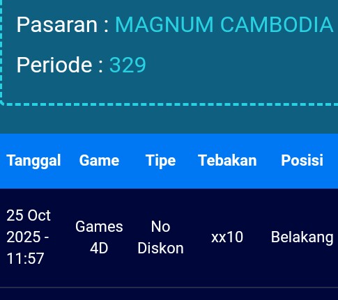 Prediksi Magnum Cambodia Jumat, 17-10-2025 Merupakan Prediksi Otomatis yang menggabungkan Metode Kalender Togel Dengan LN Generator yang akurasi prediksinya sudah kita ketahui bersama. Jadi harap Maklum Jika kadang meleset Prediksi Magnum Cambodia kita. Jadikan ini sebagai perbandingan saja dan tetap Utamakan karya sendiri
