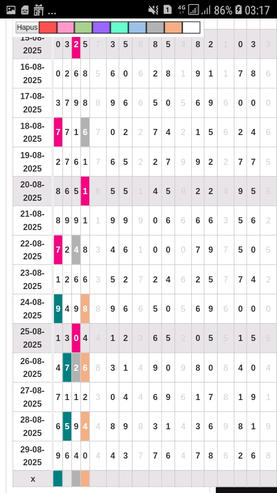 Rumus Angka Mati berdasarkan kepala harian | 05 06 08 10 15 16 17 18 19 20 21 26 27 28 29 30 32 37 38 39 40 41 43 48 52 53 54 63 64 65 74 75 76 86 87 94 95 97 98 |
