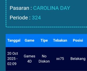 Prediksi North Carolina Day Rabu, 22-10-2025 Merupakan Prediksi Otomatis yang menggabungkan Metode Kalender Togel Dengan LN Generator yang akurasi prediksinya sudah kita ketahui bersama. Jadi harap Maklum Jika kadang meleset Prediksi North Carolina Day kita. Jadikan ini sebagai perbandingan saja dan tetap Utamakan karya sendiri