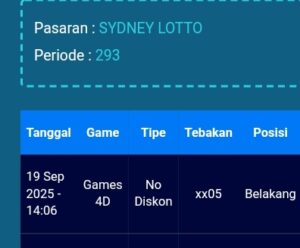 Prediksi Sydney Lotto Sabtu, 25-10-2025 Merupakan Prediksi Otomatis yang menggabungkan Metode Kalender Togel Dengan LN Generator yang akurasi prediksinya sudah kita ketahui bersama. Jadi harap Maklum Jika kadang meleset Prediksi Sydney Lotto kita. Jadikan ini sebagai perbandingan saja dan tetap Utamakan karya sendiri