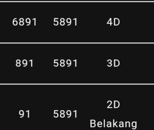 | Rumus Angka Mati berdasarkan kepala harian | 05 06 08 10 15 16 17 18 19 20 21 26 27 28 29 30 32 37 38 39 40 41 43 48 52 53 54 63 64 65 74 75 76 86 87 94 95 97 98 |