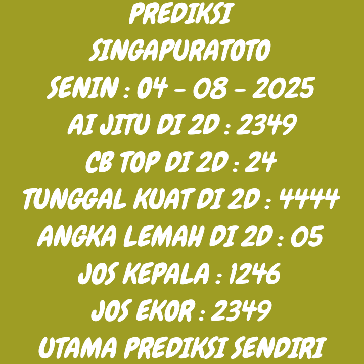 Prediksi Singapore Kamis, 23-10-2025 Merupakan Prediksi Otomatis yang menggabungkan Metode Kalender Togel Dengan LN Generator yang akurasi prediksinya sudah kita ketahui bersama. Jadi harap Maklum Jika kadang meleset Prediksi Singapore kita. Jadikan ini sebagai perbandingan saja dan tetap Utamakan karya sendiri