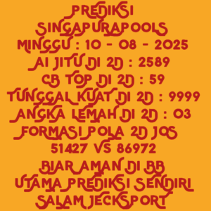 Prediksi Singapore Kamis, 23-10-2025 Merupakan Prediksi Otomatis yang menggabungkan Metode Kalender Togel Dengan LN Generator yang akurasi prediksinya sudah kita ketahui bersama. Jadi harap Maklum Jika kadang meleset Prediksi Singapore kita. Jadikan ini sebagai perbandingan saja dan tetap Utamakan karya sendiri