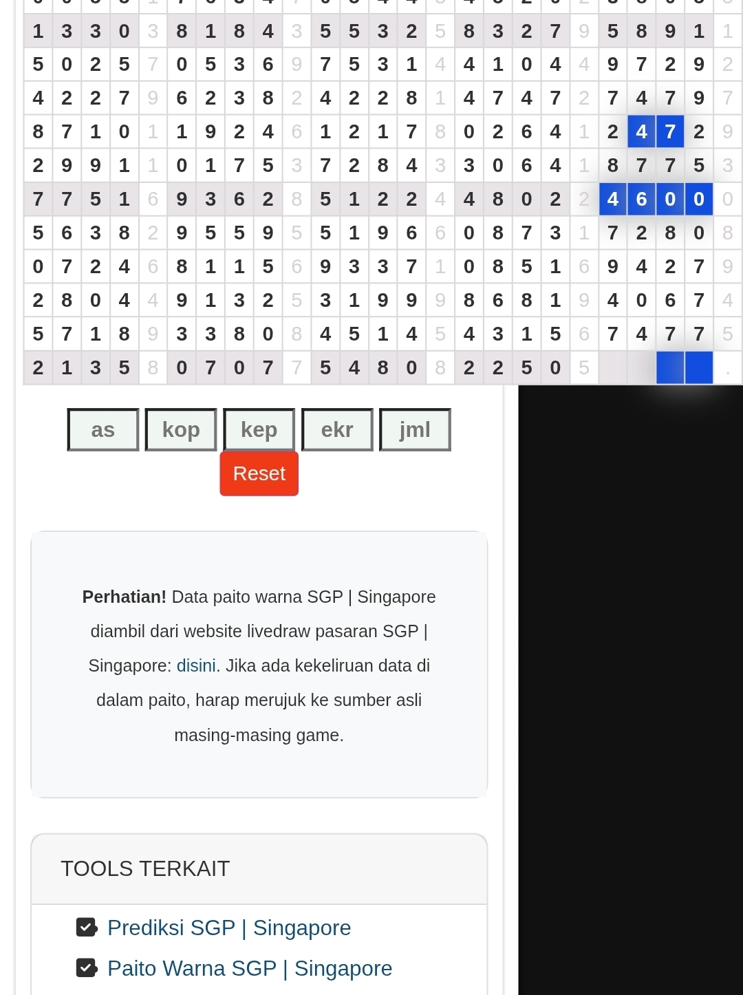 | Rumus Angka Mati berdasarkan kepala harian | 07 08 09 10 18 19 20 21 31 32 38 39 40 42 49 50 51 52 53 54 59 60 61 62 63 64 65 71 72 73 74 76 82 84 85 87 96 97 98 |