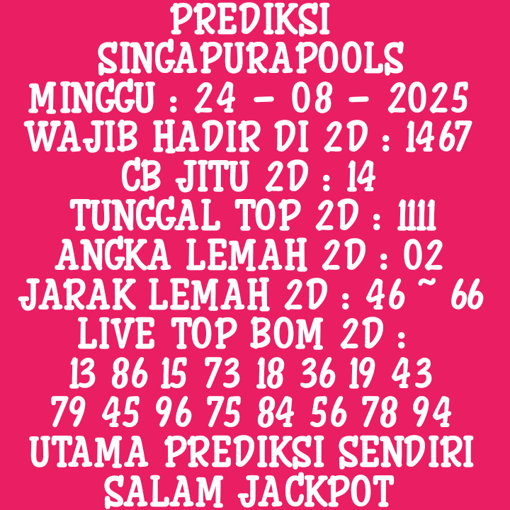 Prediksi Singapore Sabtu, 25-10-2025 Merupakan Prediksi Otomatis yang menggabungkan Metode Kalender Togel Dengan LN Generator yang akurasi prediksinya sudah kita ketahui bersama. Jadi harap Maklum Jika kadang meleset Prediksi Singapore kita. Jadikan ini sebagai perbandingan saja dan tetap Utamakan karya sendiri