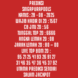 Prediksi Singapore Sabtu, 25-10-2025 Merupakan Prediksi Otomatis yang menggabungkan Metode Kalender Togel Dengan LN Generator yang akurasi prediksinya sudah kita ketahui bersama. Jadi harap Maklum Jika kadang meleset Prediksi Singapore kita. Jadikan ini sebagai perbandingan saja dan tetap Utamakan karya sendiri