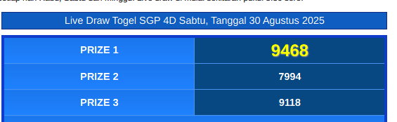 Prediksi Singapore Sabtu, 13-09-2025 Merupakan Prediksi Otomatis yang menggabungkan Metode Kalender Togel Dengan LN Generator yang akurasi prediksinya sudah kita ketahui bersama. Jadi harap Maklum Jika kadang meleset Prediksi Singapore kita. Jadikan ini sebagai perbandingan saja dan tetap Utamakan karya sendiri
