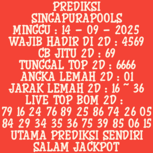 Prediksi Singapore Sabtu, 13-09-2025 Merupakan Prediksi Otomatis yang menggabungkan Metode Kalender Togel Dengan LN Generator yang akurasi prediksinya sudah kita ketahui bersama. Jadi harap Maklum Jika kadang meleset Prediksi Singapore kita. Jadikan ini sebagai perbandingan saja dan tetap Utamakan karya sendiri