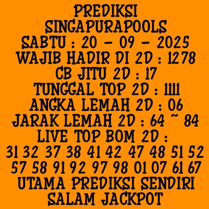 Prediksi Singapore Sabtu, 25-10-2025 Merupakan Prediksi Otomatis yang menggabungkan Metode Kalender Togel Dengan LN Generator yang akurasi prediksinya sudah kita ketahui bersama. Jadi harap Maklum Jika kadang meleset Prediksi Singapore kita. Jadikan ini sebagai perbandingan saja dan tetap Utamakan karya sendiri