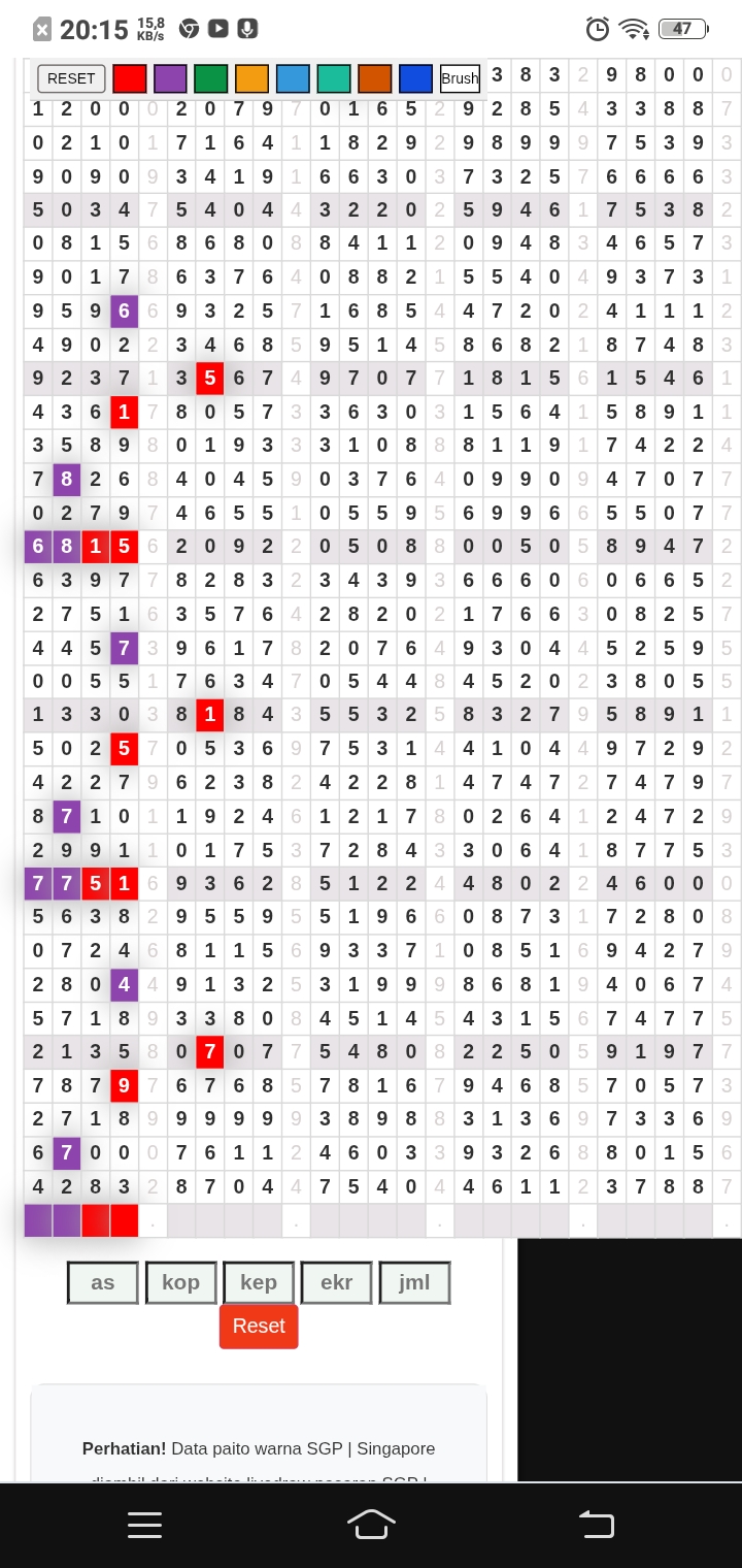 | Rumus Angka Mati berdasarkan kepala harian | 05 06 08 10 15 16 17 18 19 20 21 26 27 28 29 30 32 37 38 39 40 41 43 48 52 53 54 63 64 65 74 75 76 86 87 94 95 97 98 |