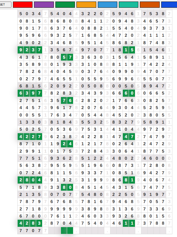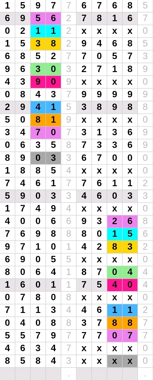 Rumus Angka Mati berdasarkan kepala harian | 04 05 06 07 09 10 15 17 18 20 21 29 30 31 32 41 42 43 53 54 61 62 64 65 72 73 75 82 83 84 85 86 87 93 94 95 96 97 98 |