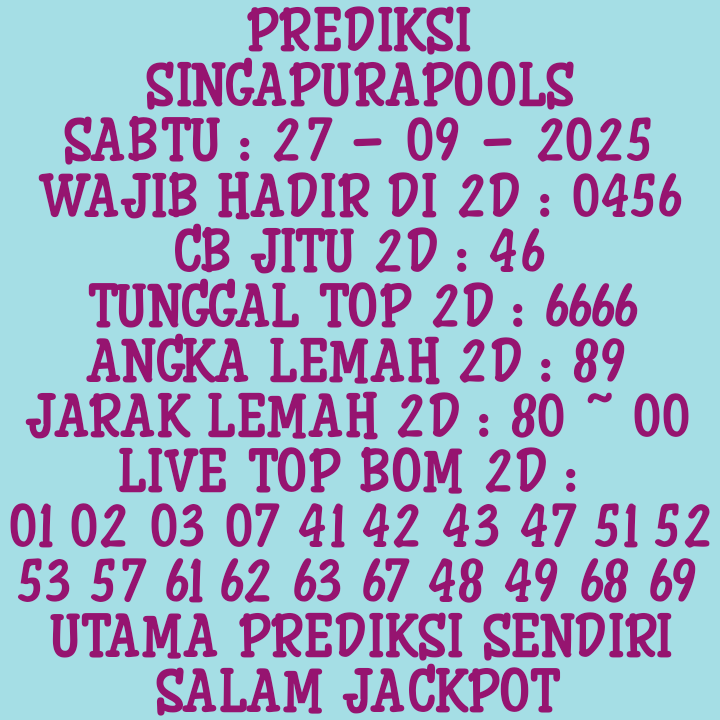 Prediksi Singapore Kamis, 23-10-2025 Merupakan Prediksi Otomatis yang menggabungkan Metode Kalender Togel Dengan LN Generator yang akurasi prediksinya sudah kita ketahui bersama. Jadi harap Maklum Jika kadang meleset Prediksi Singapore kita. Jadikan ini sebagai perbandingan saja dan tetap Utamakan karya sendiri