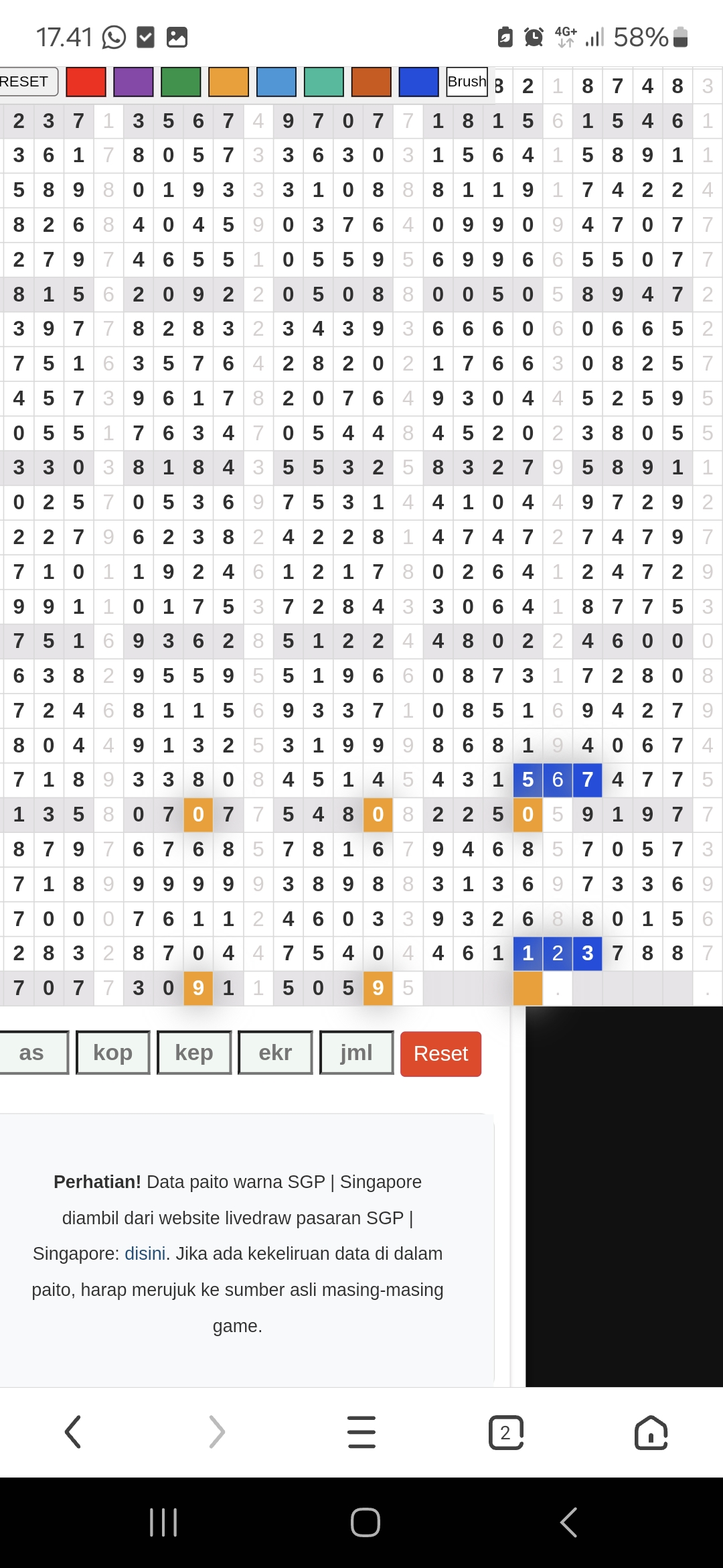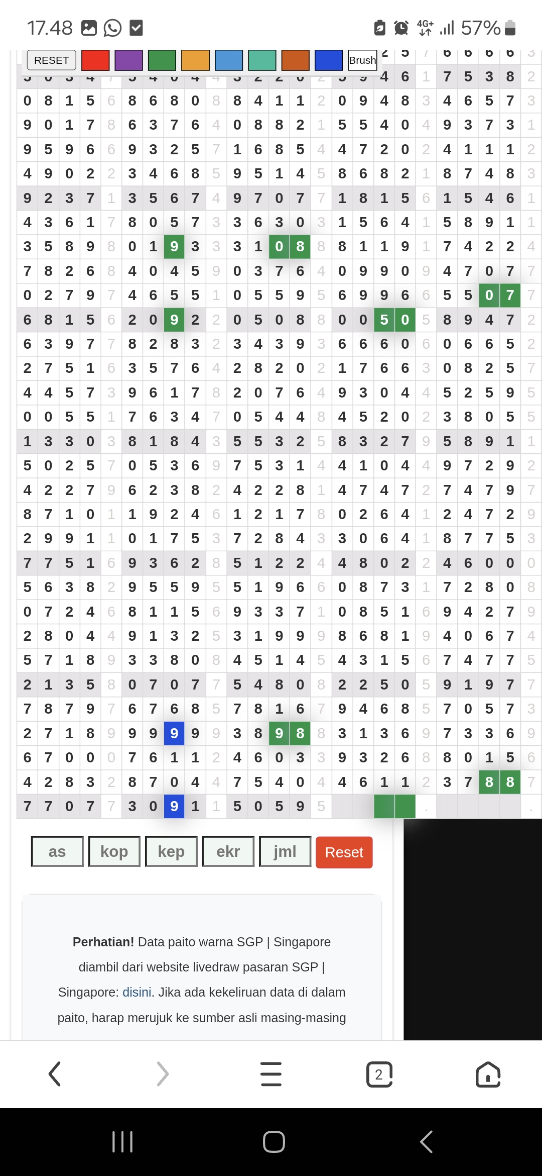 Rumus Angka Mati berdasarkan kepala harian | 05 06 08 10 15 16 17 18 19 20 21 26 27 28 29 30 32 37 38 39 40 41 43 48 52 53 54 63 64 65 74 75 76 86 87 94 95 97 98 |