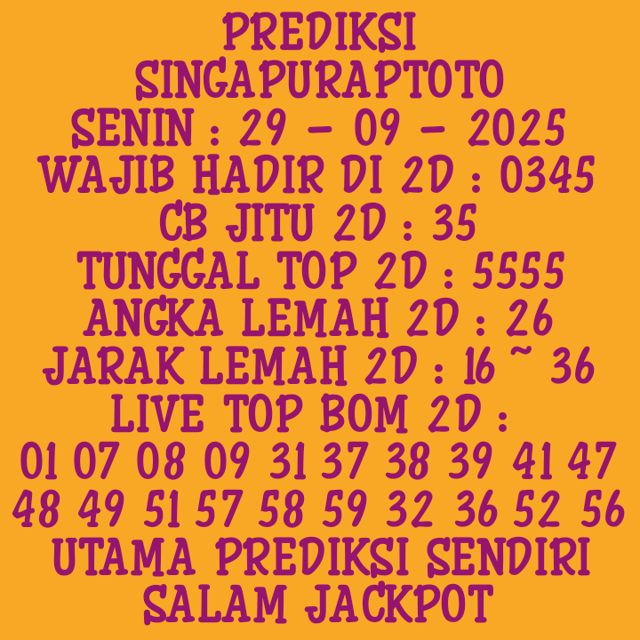 Prediksi Singapore Rabu, 22-10-2025 Merupakan Prediksi Otomatis yang menggabungkan Metode Kalender Togel Dengan LN Generator yang akurasi prediksinya sudah kita ketahui bersama. Jadi harap Maklum Jika kadang meleset Prediksi Singapore kita. Jadikan ini sebagai perbandingan saja dan tetap Utamakan karya sendiri