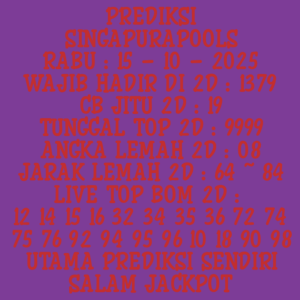 Prediksi Singapore Rabu, 22-10-2025 Merupakan Prediksi Otomatis yang menggabungkan Metode Kalender Togel Dengan LN Generator yang akurasi prediksinya sudah kita ketahui bersama. Jadi harap Maklum Jika kadang meleset Prediksi Singapore kita. Jadikan ini sebagai perbandingan saja dan tetap Utamakan karya sendiri