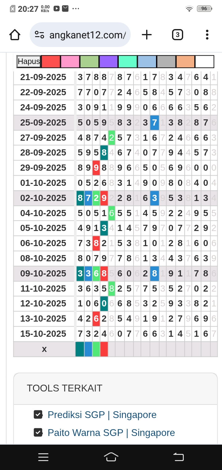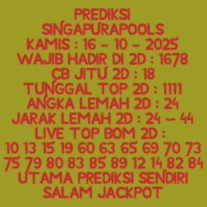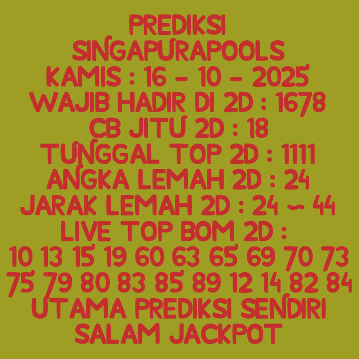 Prediksi Singapore Rabu, 22-10-2025 Merupakan Prediksi Otomatis yang menggabungkan Metode Kalender Togel Dengan LN Generator yang akurasi prediksinya sudah kita ketahui bersama. Jadi harap Maklum Jika kadang meleset Prediksi Singapore kita. Jadikan ini sebagai perbandingan saja dan tetap Utamakan karya sendiri