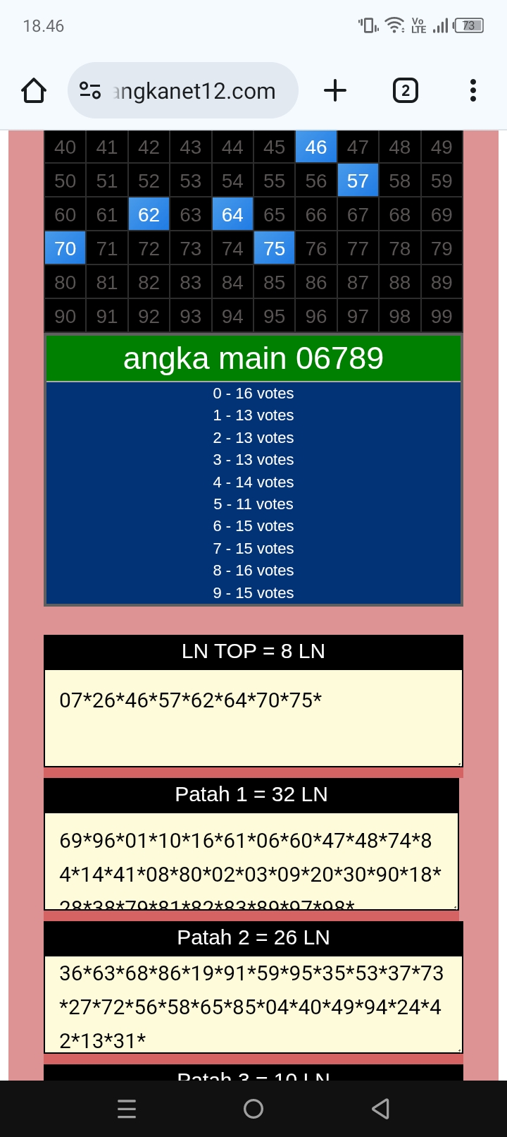 Rumus Angka Mati berdasarkan kepala harian | 05 06 08 10 15 16 17 18 19 20 21 26 27 28 29 30 32 37 38 39 40 41 43 48 52 53 54 63 64 65 74 75 76 86 87 94 95 97 98 |