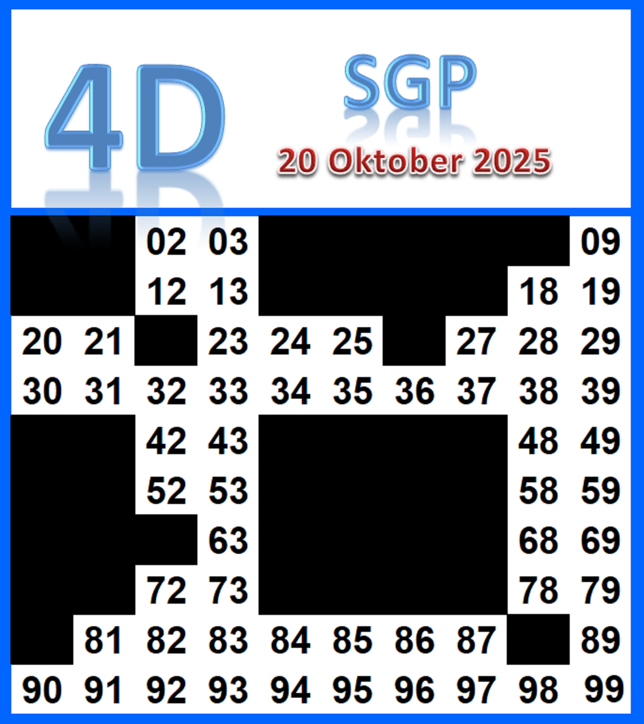 Prediksi Singapore Rabu, 22-10-2025 Merupakan Prediksi Otomatis yang menggabungkan Metode Kalender Togel Dengan LN Generator yang akurasi prediksinya sudah kita ketahui bersama. Jadi harap Maklum Jika kadang meleset Prediksi Singapore kita. Jadikan ini sebagai perbandingan saja dan tetap Utamakan karya sendiri