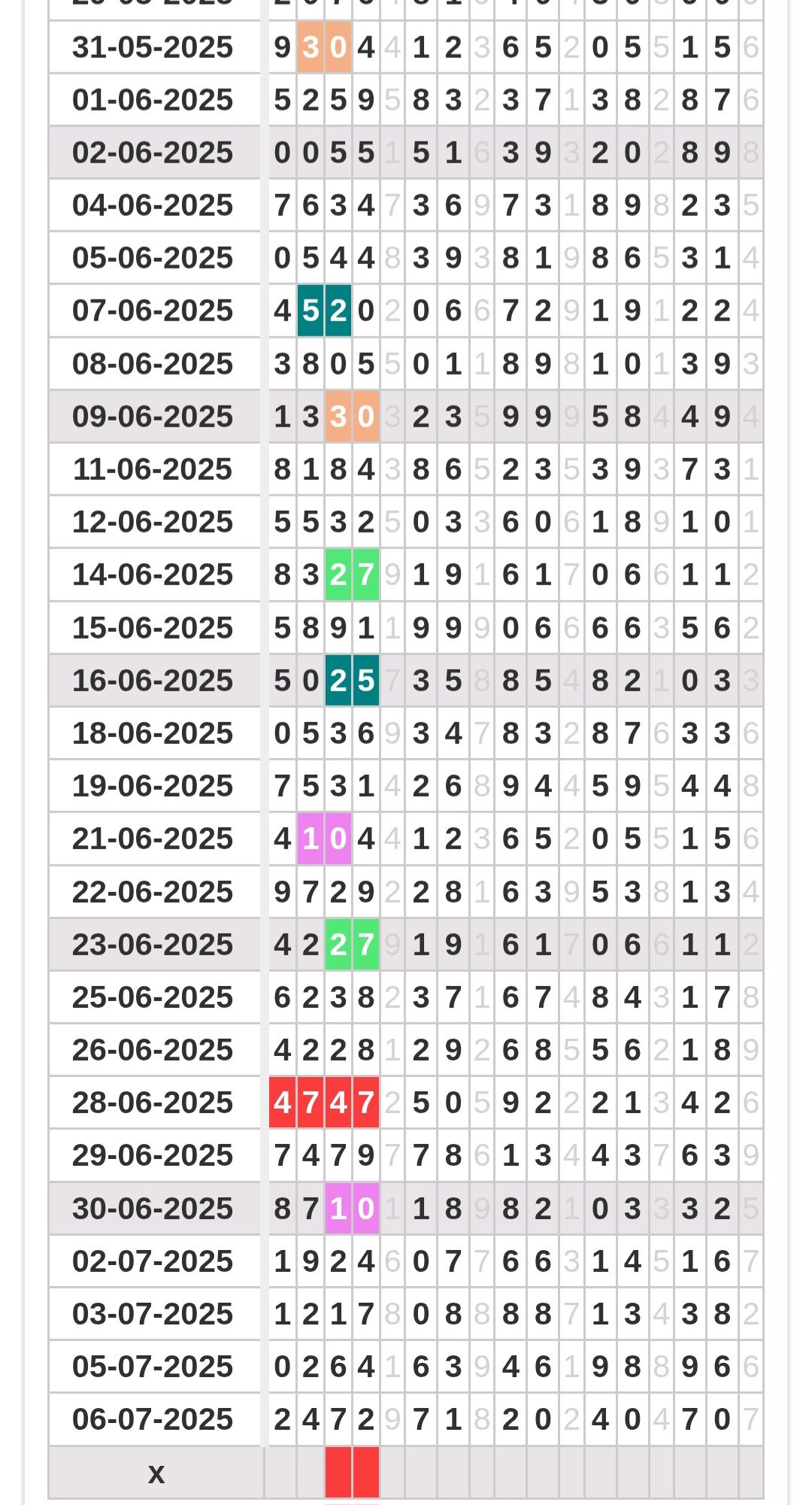 Rumus Angka Mati berdasarkan kepala harian | 05 06 08 10 15 16 17 18 19 20 21 26 27 28 29 30 32 37 38 39 40 41 43 48 52 53 54 63 64 65 74 75 76 86 87 94 95 97 98 |