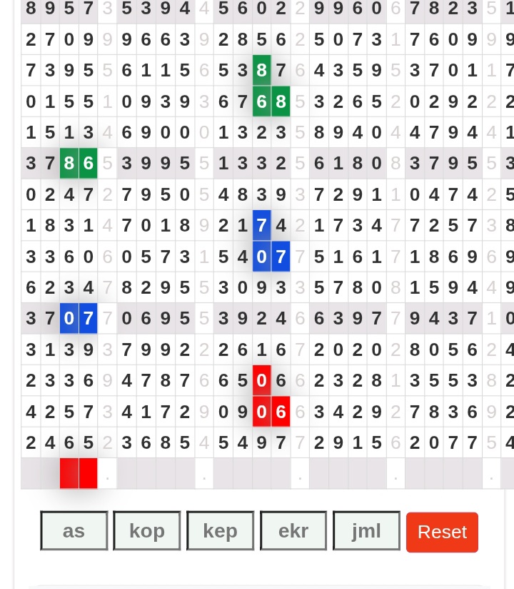 Rumus Angka Mati berdasarkan kepala harian | 07 08 09 10 19 20 21 27 28 31 38 39 40 41 42 43 48 49 50 51 52 53 54 59 60 61 62 63 65 71 73 74 76 85 86 87 96 97 98 |