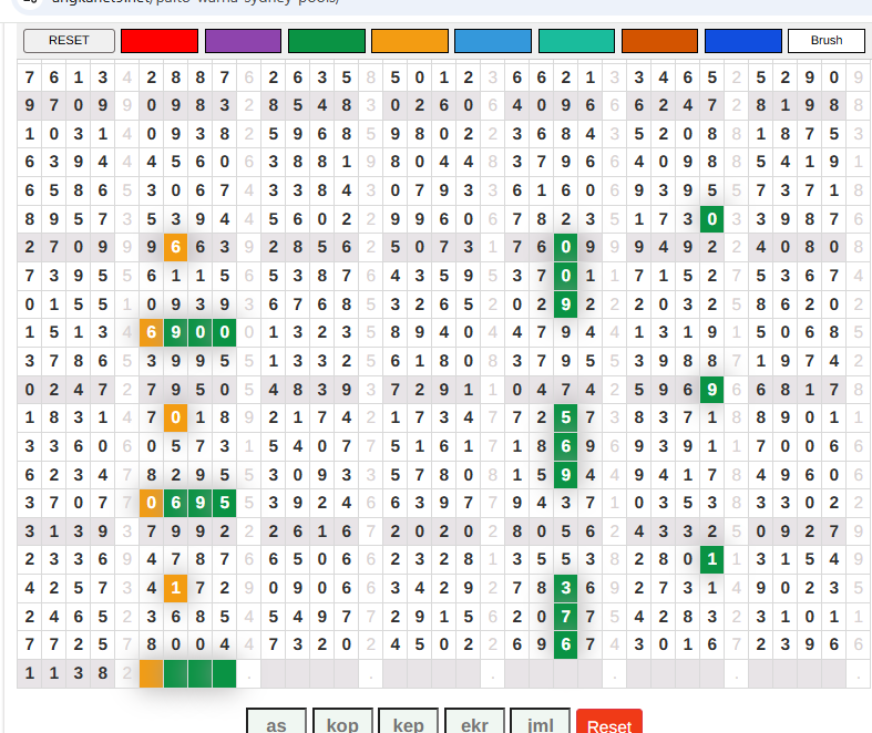 | Rumus Angka Mati berdasarkan kepala harian | 07 08 09 10 18 19 20 21 29 31 32 40 42 43 49 50 51 53 60 61 62 63 64 65 71 72 73 74 75 76 82 83 84 85 87 93 95 96 98 |