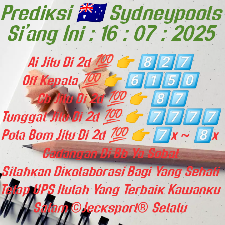 Prediksi Sydneypools Kamis, 23-10-2025 Merupakan Prediksi Otomatis yang menggabungkan Metode Kalender Togel Dengan LN Generator yang akurasi prediksinya sudah kita ketahui bersama. Jadi harap Maklum Jika kadang meleset Prediksi Sydneypools kita. Jadikan ini sebagai perbandingan saja dan tetap Utamakan karya sendiri