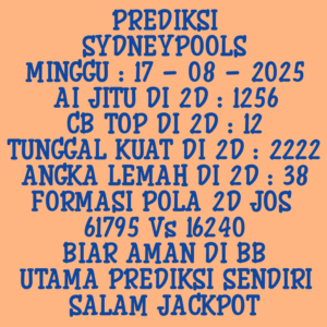 Prediksi Sydneypools Kamis, 23-10-2025 Merupakan Prediksi Otomatis yang menggabungkan Metode Kalender Togel Dengan LN Generator yang akurasi prediksinya sudah kita ketahui bersama. Jadi harap Maklum Jika kadang meleset Prediksi Sydneypools kita. Jadikan ini sebagai perbandingan saja dan tetap Utamakan karya sendiri