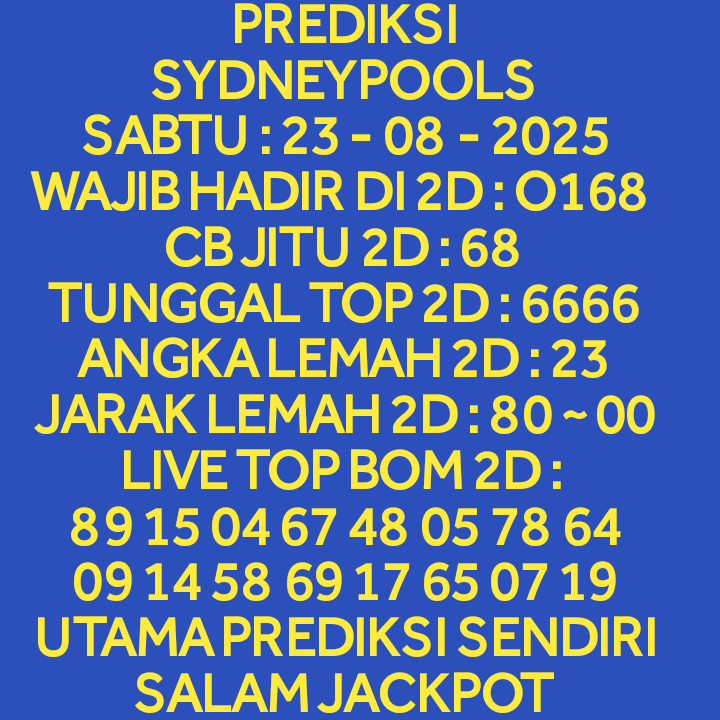 Prediksi Sydneypools Kamis, 23-10-2025 Merupakan Prediksi Otomatis yang menggabungkan Metode Kalender Togel Dengan LN Generator yang akurasi prediksinya sudah kita ketahui bersama. Jadi harap Maklum Jika kadang meleset Prediksi Sydneypools kita. Jadikan ini sebagai perbandingan saja dan tetap Utamakan karya sendiri