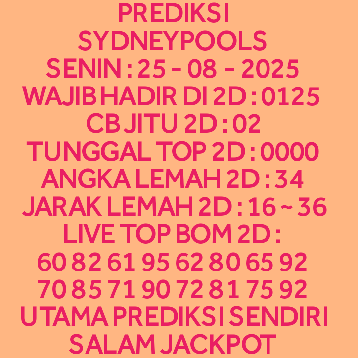 Prediksi Sydneypools Jumat, 24-10-2025 Merupakan Prediksi Otomatis yang menggabungkan Metode Kalender Togel Dengan LN Generator yang akurasi prediksinya sudah kita ketahui bersama. Jadi harap Maklum Jika kadang meleset Prediksi Sydneypools kita. Jadikan ini sebagai perbandingan saja dan tetap Utamakan karya sendiri
