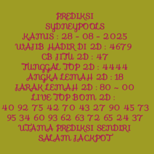 Prediksi Sydneypools Jumat, 26-09-2025 Merupakan Prediksi Otomatis yang menggabungkan Metode Kalender Togel Dengan LN Generator yang akurasi prediksinya sudah kita ketahui bersama. Jadi harap Maklum Jika kadang meleset Prediksi Sydneypools kita. Jadikan ini sebagai perbandingan saja dan tetap Utamakan karya sendiri