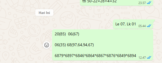 Rumus Angka Mati berdasarkan kepala harian | 08 09 10 16 17 19 20 27 28 30 31 32 37 38 39 40 41 42 43 48 49 50 51 52 54 59 60 62 63 65 74 75 76 85 86 87 96 97 98 |