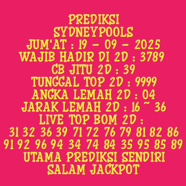 Prediksi Sydneypools Senin, 27-10-2025 Merupakan Prediksi Otomatis yang menggabungkan Metode Kalender Togel Dengan LN Generator yang akurasi prediksinya sudah kita ketahui bersama. Jadi harap Maklum Jika kadang meleset Prediksi Sydneypools kita. Jadikan ini sebagai perbandingan saja dan tetap Utamakan karya sendiri