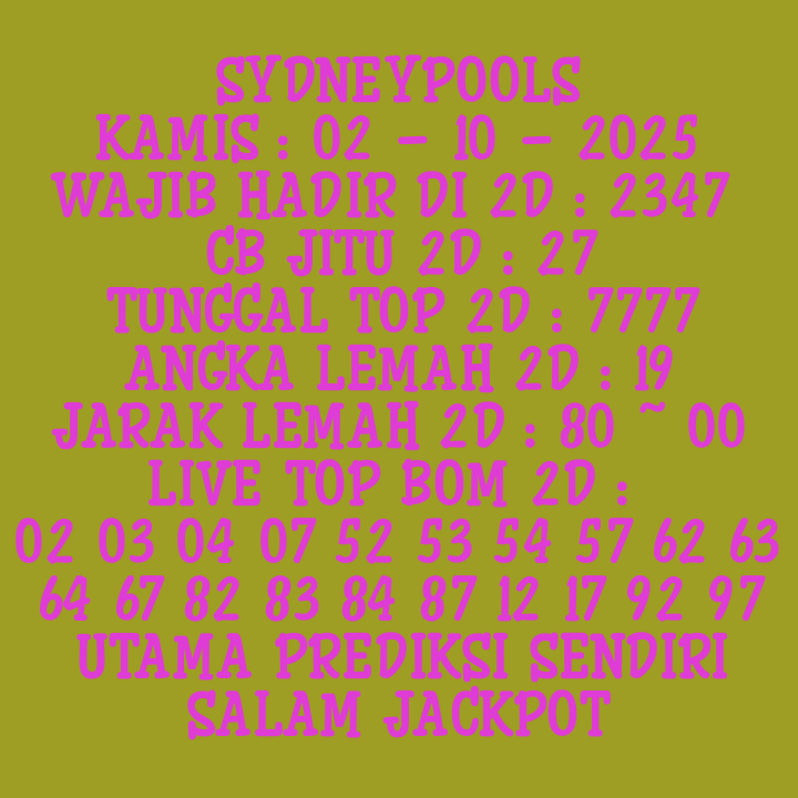 Prediksi Sydneypools Kamis, 23-10-2025 Merupakan Prediksi Otomatis yang menggabungkan Metode Kalender Togel Dengan LN Generator yang akurasi prediksinya sudah kita ketahui bersama. Jadi harap Maklum Jika kadang meleset Prediksi Sydneypools kita. Jadikan ini sebagai perbandingan saja dan tetap Utamakan karya sendiri