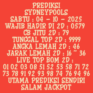 Prediksi Sydneypools Rabu, 22-10-2025 Merupakan Prediksi Otomatis yang menggabungkan Metode Kalender Togel Dengan LN Generator yang akurasi prediksinya sudah kita ketahui bersama. Jadi harap Maklum Jika kadang meleset Prediksi Sydneypools kita. Jadikan ini sebagai perbandingan saja dan tetap Utamakan karya sendiri