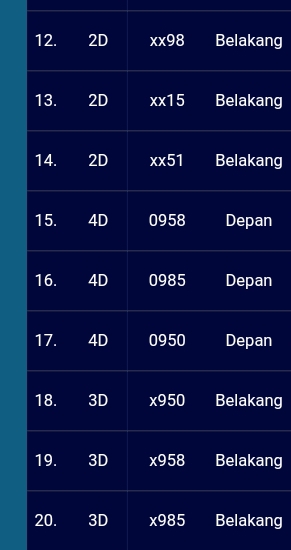 Rumus Angka Mati berdasarkan kepala harian | 05 06 08 09 16 17 19 20 21 26 27 28 29 30 31 32 37 38 39 40 41 43 48 49 51 52 54 59 63 64 65 74 75 76 85 86 87 97 98 |