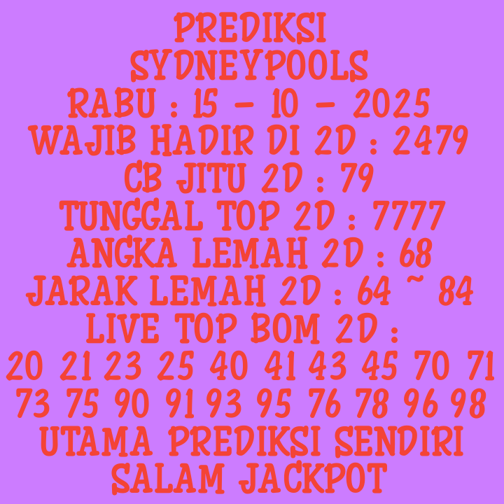Prediksi Sydneypools Selasa, 21-10-2025 Merupakan Prediksi Otomatis yang menggabungkan Metode Kalender Togel Dengan LN Generator yang akurasi prediksinya sudah kita ketahui bersama. Jadi harap Maklum Jika kadang meleset Prediksi Sydneypools kita. Jadikan ini sebagai perbandingan saja dan tetap Utamakan karya sendiri