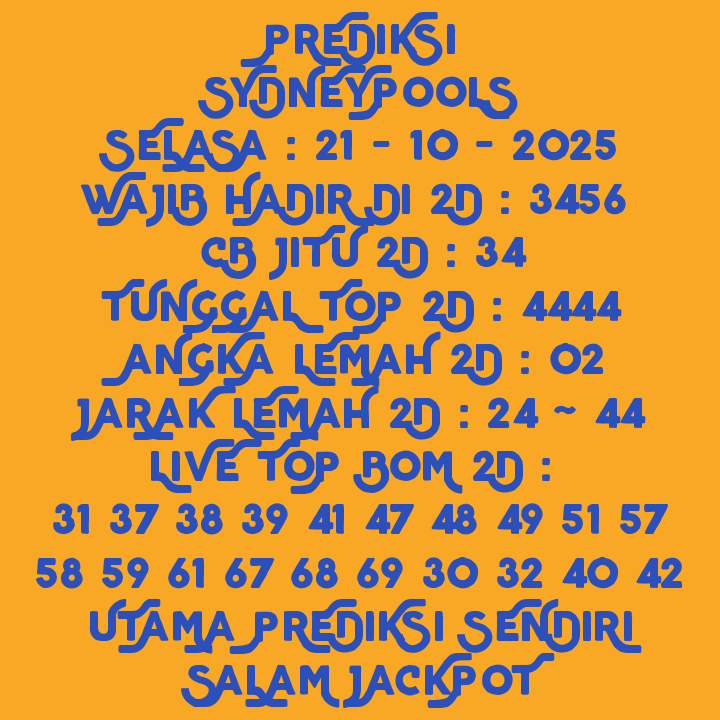 Prediksi Sydneypools Rabu, 22-10-2025 Merupakan Prediksi Otomatis yang menggabungkan Metode Kalender Togel Dengan LN Generator yang akurasi prediksinya sudah kita ketahui bersama. Jadi harap Maklum Jika kadang meleset Prediksi Sydneypools kita. Jadikan ini sebagai perbandingan saja dan tetap Utamakan karya sendiri