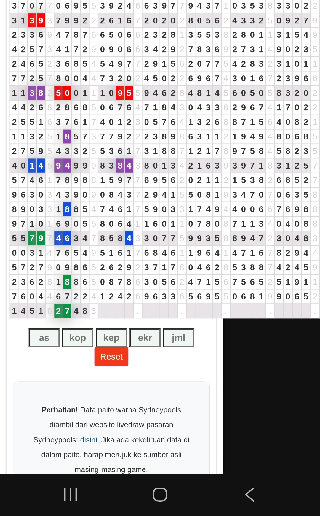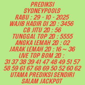 Prediksi Sydneypools Selasa, 07-10-2025 Merupakan Prediksi Otomatis yang menggabungkan Metode Kalender Togel Dengan LN Generator yang akurasi prediksinya sudah kita ketahui bersama. Jadi harap Maklum Jika kadang meleset Prediksi Sydneypools kita. Jadikan ini sebagai perbandingan saja dan tetap Utamakan karya sendiri