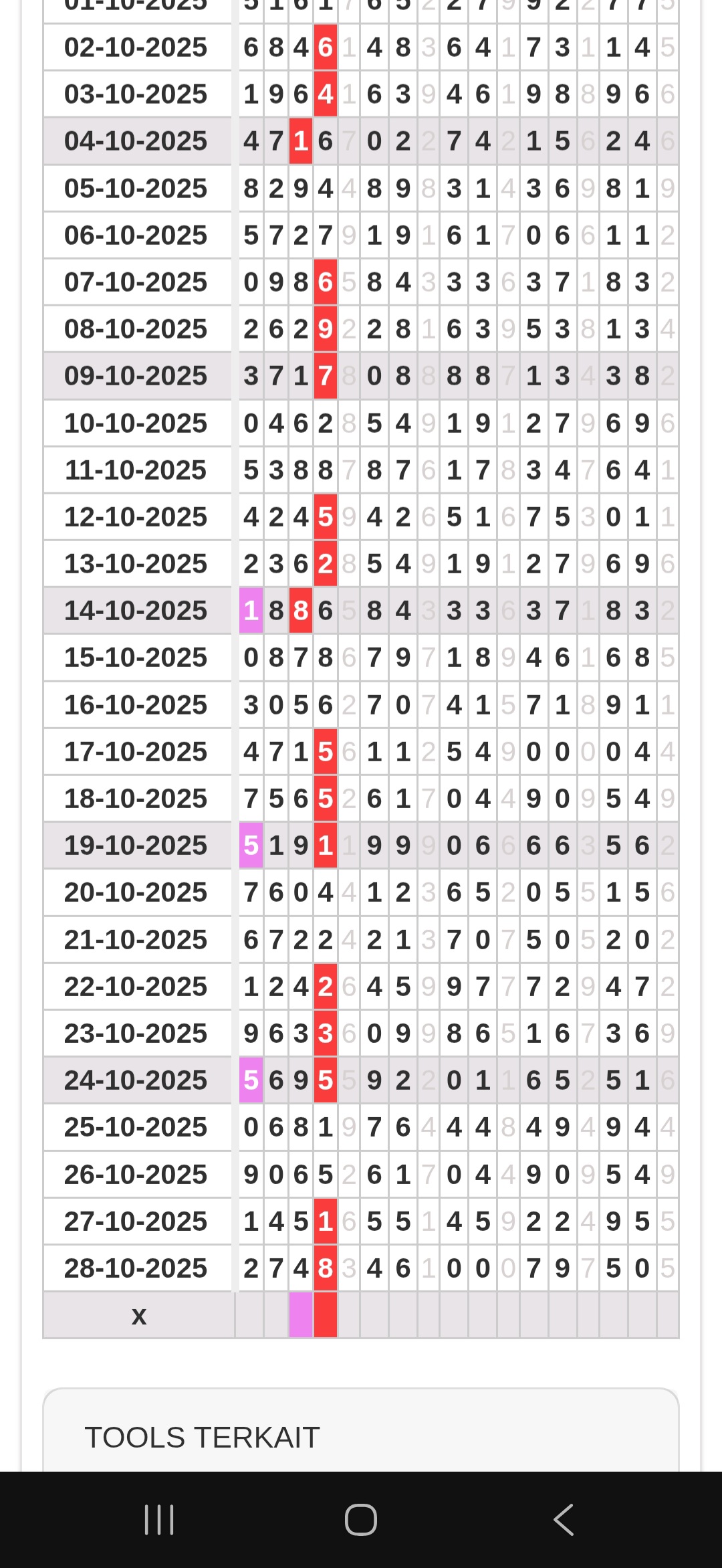 | Rumus Angka Mati berdasarkan kepala harian | 05 06 08 09 16 17 19 20 21 26 27 28 29 30 31 32 37 38 39 40 41 43 48 49 51 52 54 59 63 64 65 74 75 76 85 86 87 97 98 |